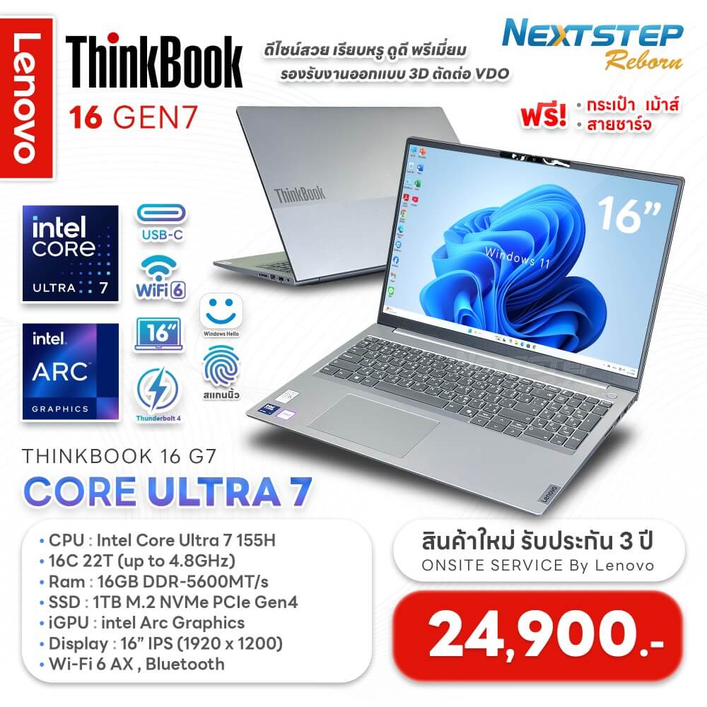 Lenovo ThinkBook 16 Gen7 รุ่นนี้มาพร้อมกับ Intel Core Ultra 7 ตัวแรงที่มีประสิทธิภาพสูง แบบ 16 Core 22 Thread อีกทั้งยังมีชิป NPU ที่ช่วยการประมวลผลด้าน AI และยังมี iGPU กราฟิกรุ่นใหม่อย่าง Intel Arc ที่แรงขึ้นกว่าเจนก่อนถึง 2 เท่า ทำให้รองรับงานด้าน 3D เรนเดอร์ CAD และเล่นเกมส์ได้ลื่นขึ้นกว่าเดิม ด้วยหน้าจอขนาดใหญ่ 16 นิ้วเต็มตา รองรับทุกการทำงานได้เป็นอย่างดี