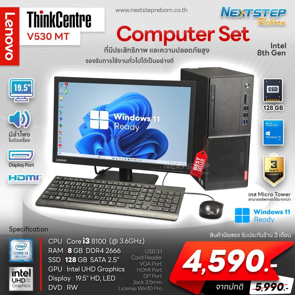 PC Lenovo ThinkCentre V530 MT รุ่นนี้มาพร้อมกับ CPU intel Core i3 Gen8 พร้อมหน้าจอ 19.5 นิ้ว กับ Body Micro Tower ที่สามารถอัพเกรด Ram, SSD, M.2, HDD และ VGA Card เพิ่มได้ สเปคนี้เหมาะสำหรับการใช้งานพื้นฐานทั่วไป ดูหนัง ฟังเพลง ทำงาน อินเตอร์เน็ต และยังมาพร้อม License Windows 10 Pro อีกด้วย