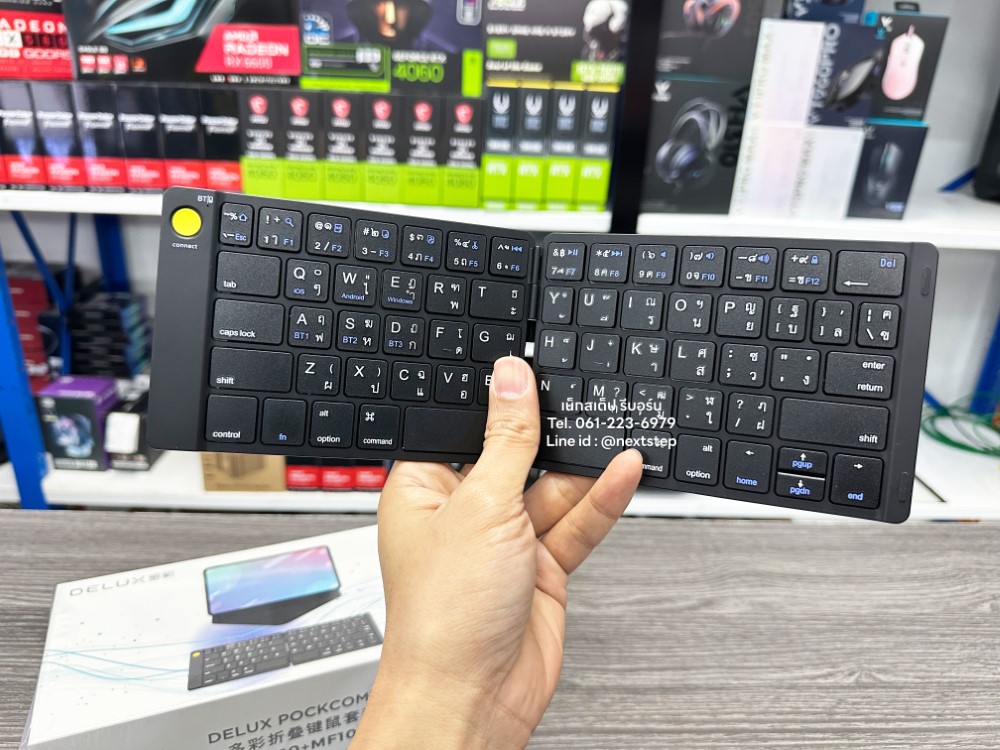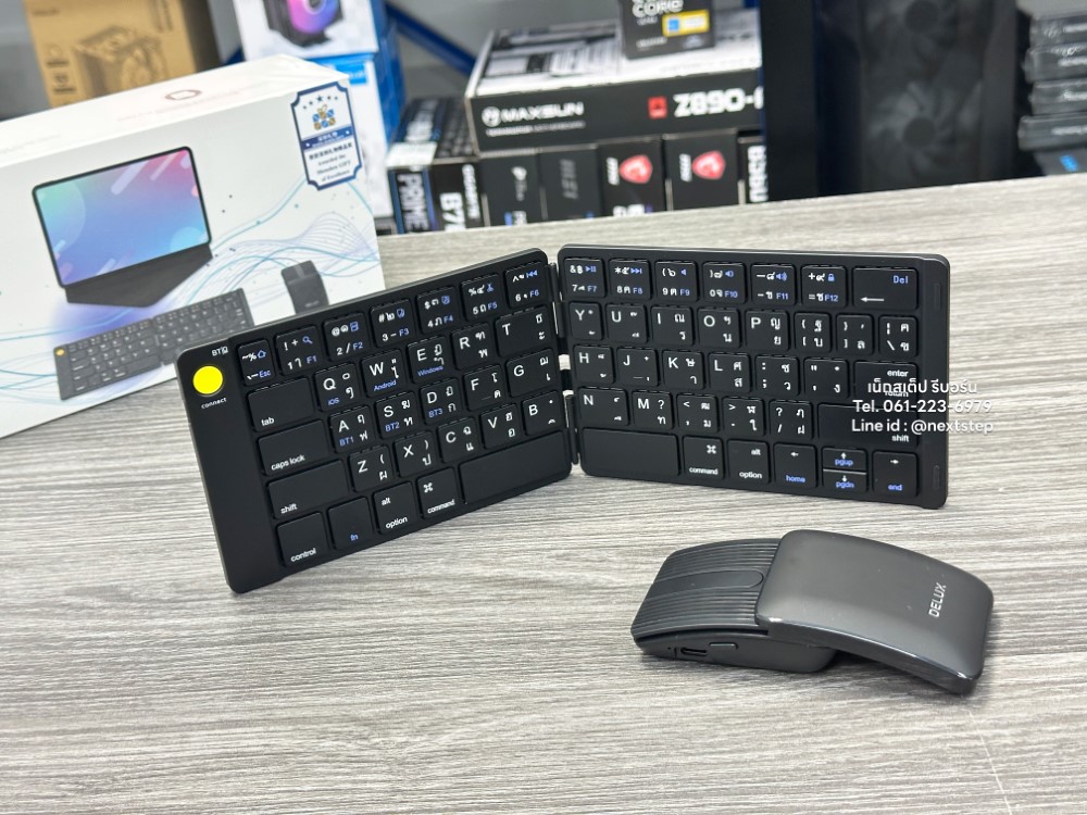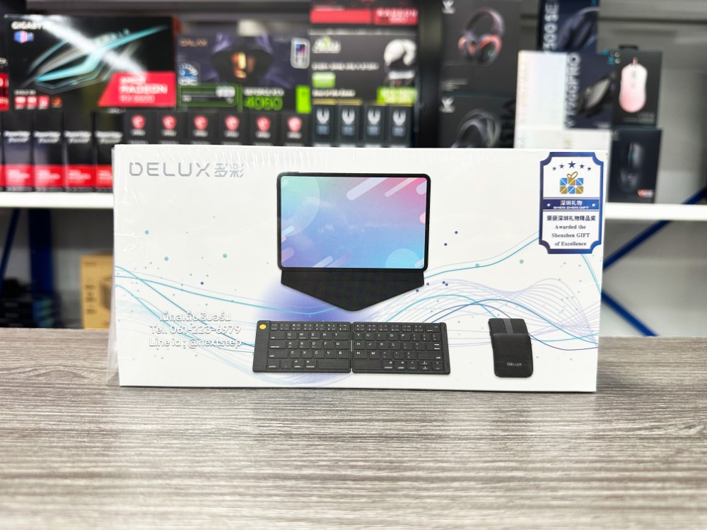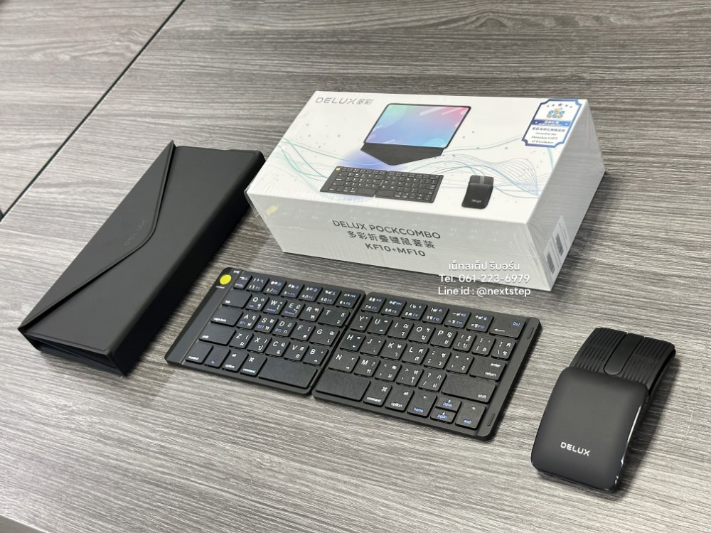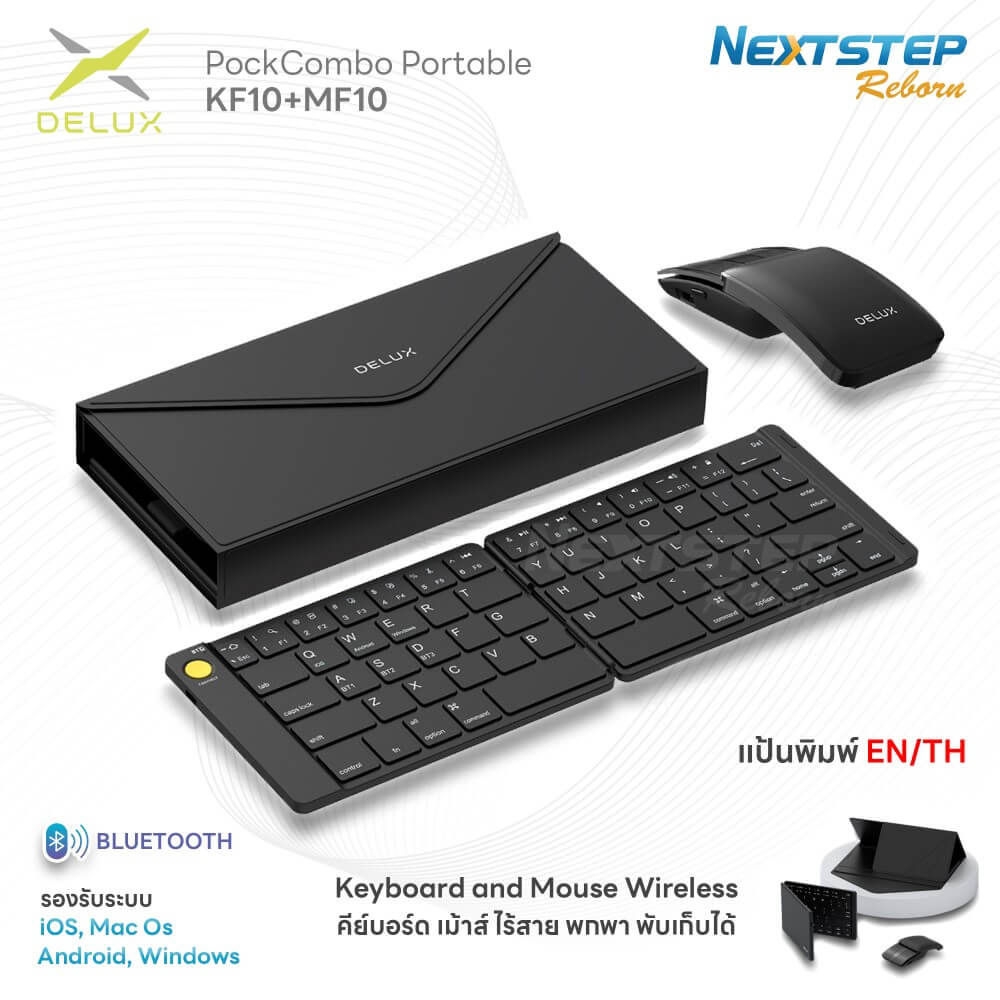 DELUX PockCombo KF10 MF10 รุ่นนี้เป็นคีย์บอร์ด และเม้าส์ ไร้สายแบบพกพาได้ รองรับอุปกรณ์ระบบ ios, Mac OS, Android และ Windows โดยเชื่อมต่อผ่าน Bluetooth 5.0 มีขนาดเล็ก บางเบา พกพาง่าย สามารถพับเก็บได้ด้วย